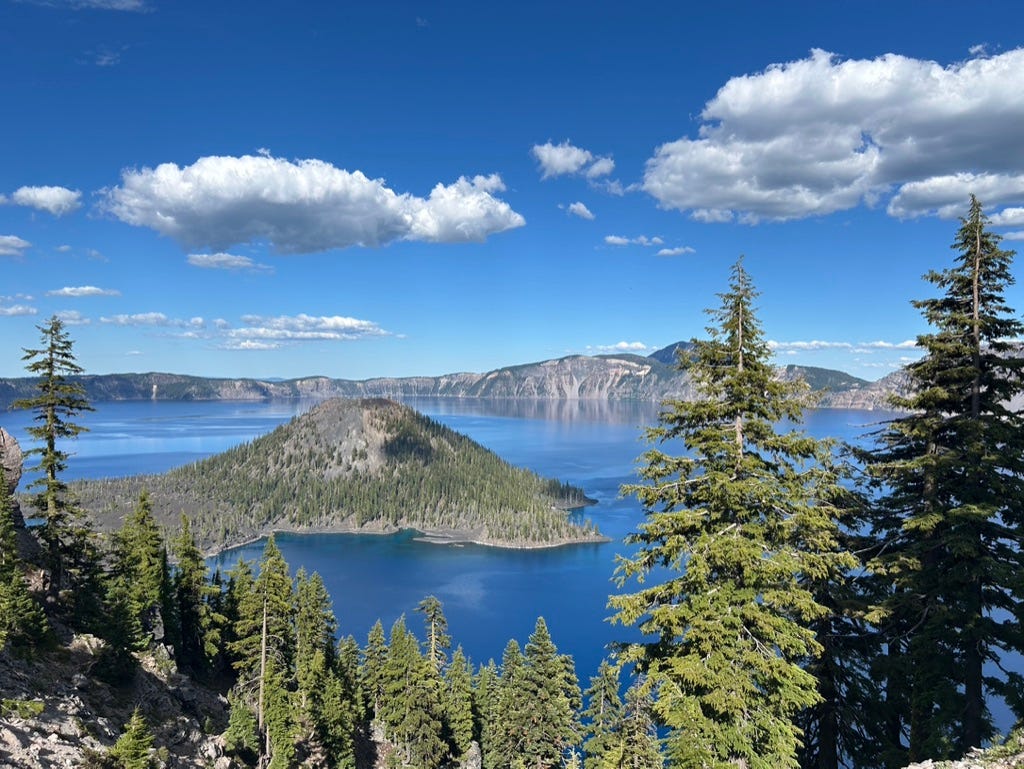 Due to repairs on the lake access trail, 2025 was going to be the last year to swim in Crater Lake until 2029, so we simply had to go check it out (I’d never been) and swim. My family and I were halfway around the Rim Trail in Crater National Park when the battery light in our Kia Sorento came on. We’d just finished a strenuous hike back up from Cleetwood Cove—where we’d swam in the cold and clear bluest of blue water of Crater Lake—and were driving toward our campground in the Mazama Village to meet some family. Hopefully nothing I thought, regarding the light. But then every single light on the dashboard came on. The power steering went out as we crept through the campground until, finally, not yet to our campsite, the car just died next to the campground bathroom. We got a jump and the car sputtered for another thirty or so feet before dying again. The car was ten years old, but it wasn’t like, an old car. And I mean, not the worst place we could breakdown? At least we’d made it to the campsite, right?